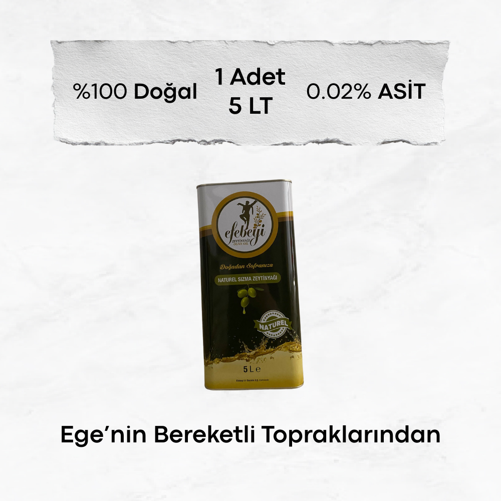 Teneke ambalaj, zeytinyağını ışık ve dış etkenlerden koruyarak tazeliğini daha uzun süre muhafaza etmesini sağlar. 5 litrelik hacmiyle aile kullanımı için idealdir.